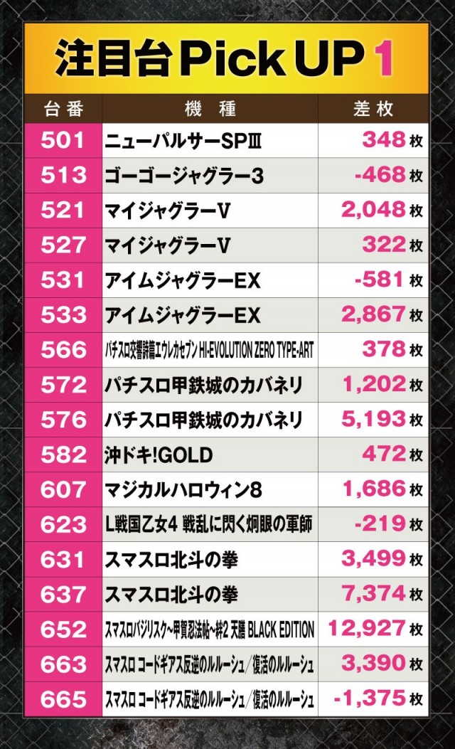 『スマスロ北斗の拳』や『パチスロ甲鉄城のカバネリ』は+7,374枚・+5,193枚など大活躍。新台の『スマスロ コードギアス反逆のルルーシュ/復活のルルーシュ』も+3,390枚と機種性能をいかんなく発揮できていたようだ。
