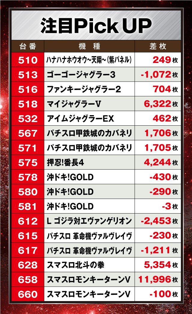 今回も至る所から好調台が誕生しており、なかでも『スマスロモンキーターンV』は+11,996枚と圧巻のパフォーマンスを見せている!