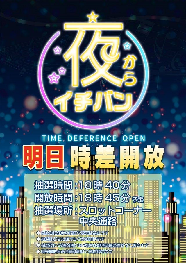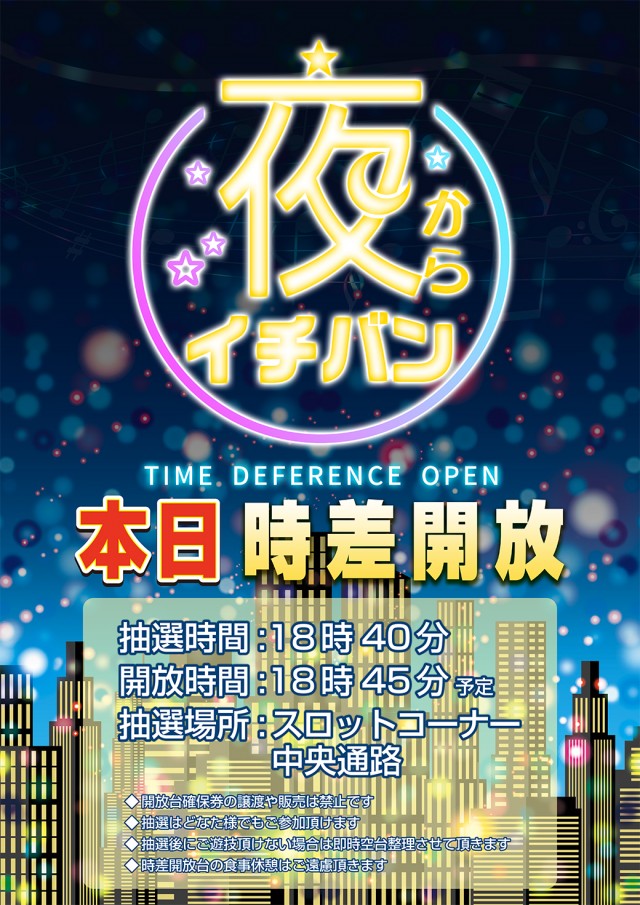 本日、夜からイチバン!!時差開放18時45分開放【予定】