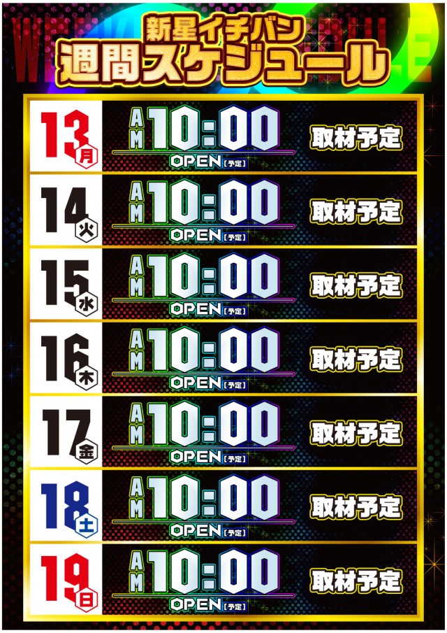 2025/10/14明日、新台入替AM10:00オープン【予定】       朝9時30分より入場抽選開始!! 皆さまのご来店を心よりお待ちしております。