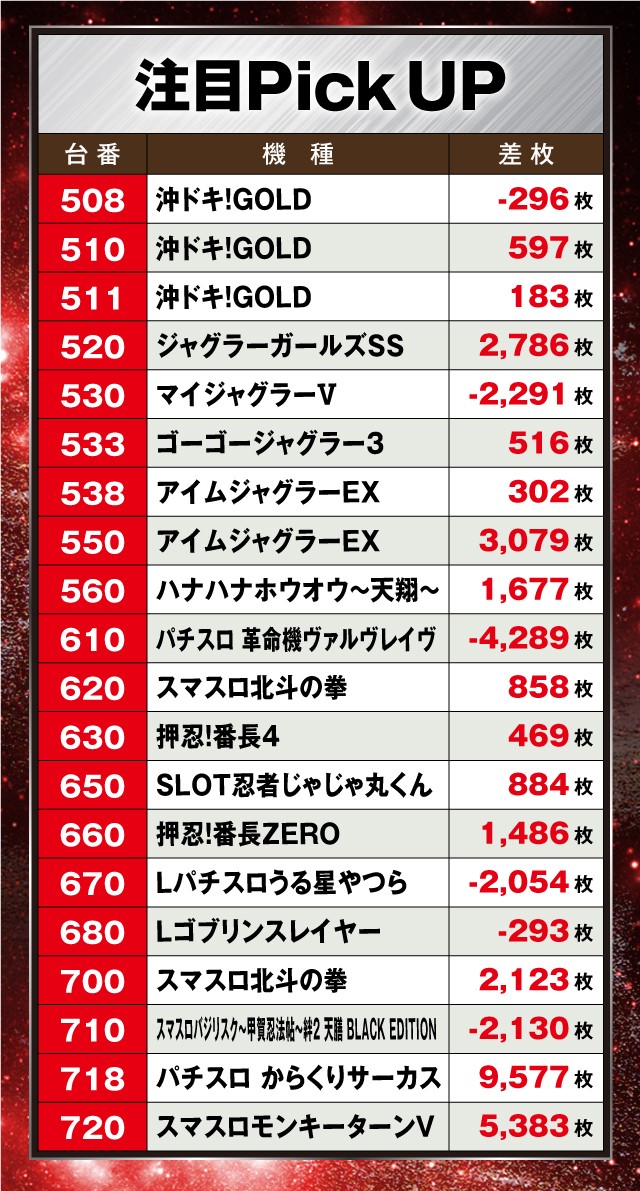 今回は「末尾0」を中心に好調台が誕生していた。「末尾0」は全部で15台となっており、『スマスロモンキーターンV』は+5,000枚オーバーと見事なパフォーマンスを披露している。
