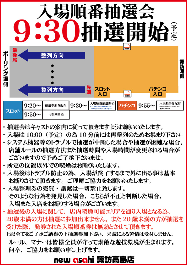 | ルール詳細 | パチンコ9:55入場整理券配布 スロット9:30入場抽選会開始 |