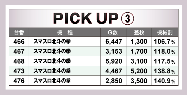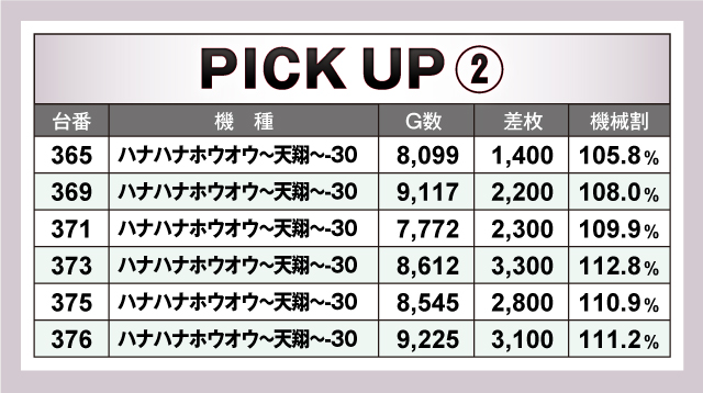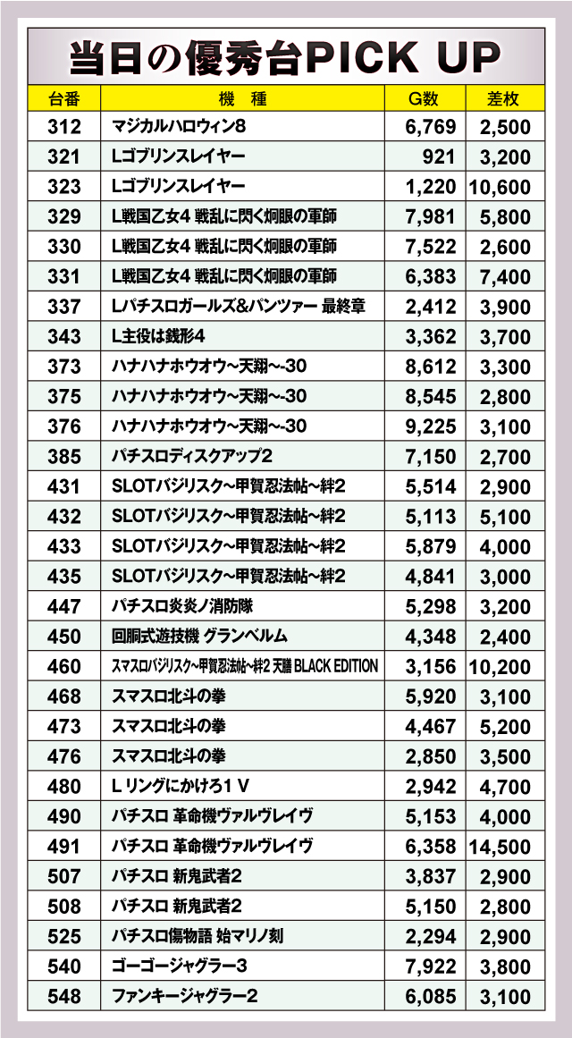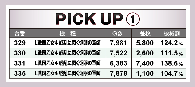 続いては、当日とくに店内を盛り上げた3機種を紹介していこう。ピックアップ平均を見てみると、3機種すべてが平均差枚+2,000枚オーバーで、とくに「L戦国乙女4 戦乱に閃く炯眼の軍師」の4台は、平均差枚+4,225枚と圧倒的! また、「ハナハナホウオウ~天翔~-30」も優秀で、ノーマルタイプながら平均差枚+2,517枚とハイスペックに負けない結果を残していた!