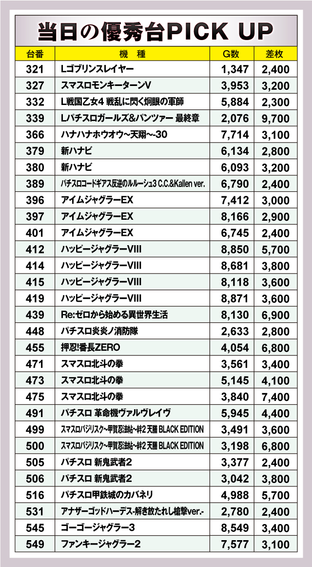 まずは優秀台30台のチェックから。30台全てが+2,000枚オーバーを記録し、+3,000枚オーバーは21台出現。それらのなかでもっとも優秀だったのは、339番台の「Lパチスロガールズ&パンツァー 最終章」で、差枚+9,700枚の大記録をマーク! ランクイン機種を見渡すと、スマスロを中心に人気機種がズラリ。とくにスマスロでは「スマスロ北斗の拳」や「スマスロバジリスク~甲賀忍法帖~絆2 天膳 BLACK EDITION」が目立っており、またノーマルタイプでは「アイムジャグラーEX」「ハッピージャグラーVIII」などのジャグラーシリーズが活躍を見せていた!