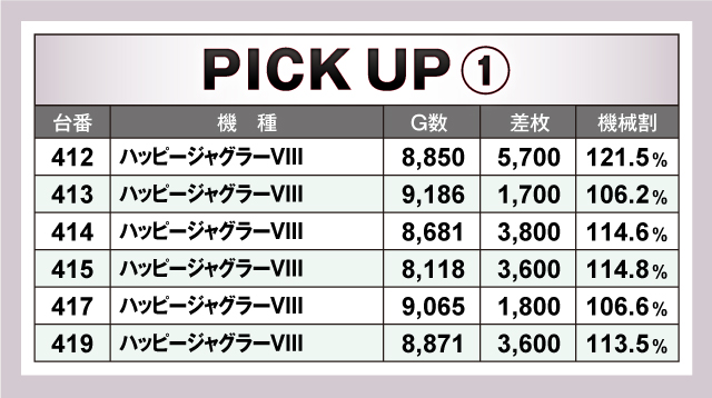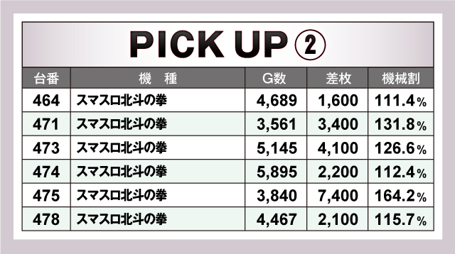 続いては、当日とくに盛り上がっていた2機種を紹介。まず「ハッピージャグラーVIII」は、ピックアップ6台の平均差枚は+3,367枚とアベレージの高い結果をマーク! また「スマスロ北斗の拳」も好調で、475番台の+7,400枚をはじめとして好記録を複数確認! こちらもピックアップ6台の平均差枚+3,467枚と素晴らしい結果を残していた!