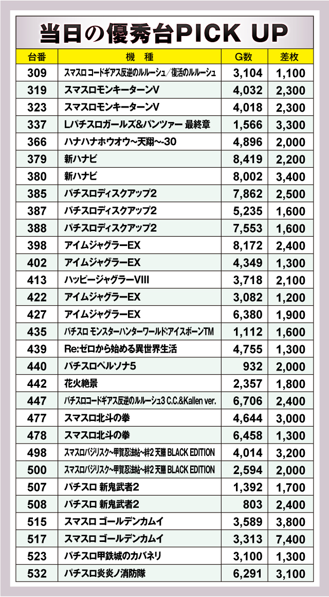 まずは優秀台30台の紹介から。30台のうち18台が+2,000枚オーバーをマークし、+3,000枚オーバーは7台出現。それらのなかでもっとも優秀だったのは、517番台の「スマスロ ゴールデンカムイ」で、差枚+7,400枚を獲得! その他ランクイン機種を詳しく見ると、スマスロ人気台や最新台のほか、「新ハナビ」や「パチスロディスクアップ2」など幅広い機種が多数ランクインしていた!