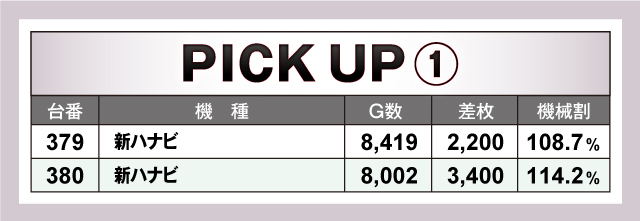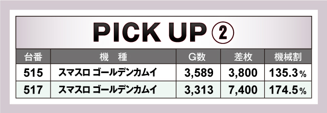 続いては、当日とくに盛り上がっていた2機種を紹介。まず「新ハナビ」は、ピックアップ2台どちらも+2,000枚以上のプラスで、平均差枚+2,800枚と上々の結果! そして「スマスロ ゴールデンカムイ」は、最優秀台を含めた2台平均差枚+5,600枚と他を圧倒する素晴らしい結果をマーク! これら2機種の他にも良台は店内のいたるところに出現していたぞ!