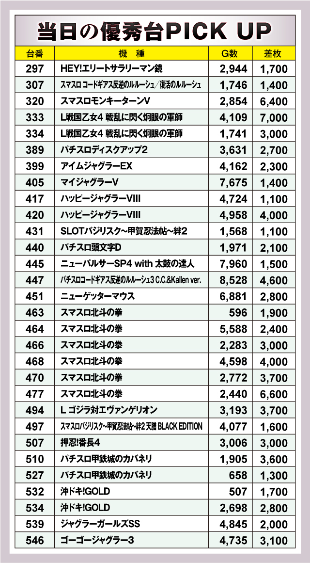 まずは優秀台30台を紹介していこう。30台のうち20台が差枚+2,000枚を超えており、+3,000枚超えは13台出現。それらのなかでもっとも優秀だったのは、333番台の「L戦国乙女4 戦乱に閃く炯眼の軍師」で、差枚+7,000枚を獲得! またランクイン機種はスマスロを中心に多くの機種から好記録を確認できたことから、幅広い機種にチャンスが隠されていた可能性が高そうだ!