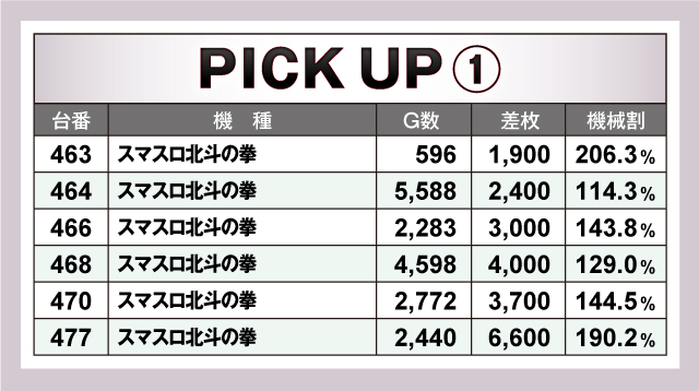 続いては、当日とくに店内を盛り上げた「スマスロ北斗の拳」を紹介していこう。ピックアップ30台のうち6台がランクインし、好記録が複数出現! ピックアップ6台のうち4台が+3,000枚オーバーの好記録をマークしており、平均差枚は+3,600枚と他を圧倒する好記録を残していた!