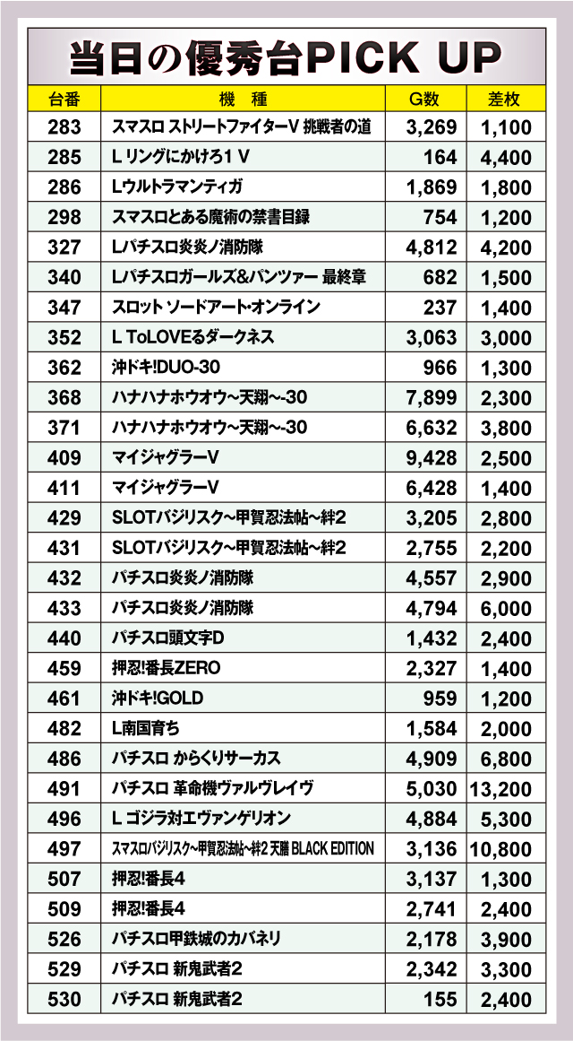 まずは優秀台30台のチェックから。30台のうち20台が+2,000枚オーバーを記録し、+3,000枚オーバーは11台出現。それらのなかでもっとも優秀だったのは、491番台の「パチスロ 革命機ヴァルヴレイヴ」で、差枚はなんと+13,200枚をマーク! またランクイン機種を見渡すと、メイン機種からバラエティ機種まで多種多様な機種がランクインしていたので、店内の至る所にチャンスが隠されていた可能性が高そうだ!