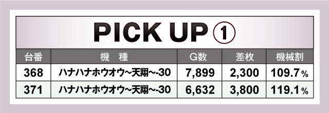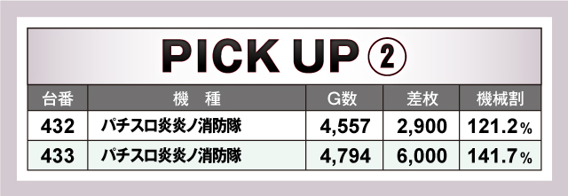続いては、当日特に賑わっていた2機種を紹介しよう。まずは「ハナハナホウオウ~天翔~-30」で、ピックアップ2台の平均差枚は+3,050枚と素晴らしい結果をマーク! 続いて「パチスロ炎炎ノ消防隊」も優秀で、平均差枚+4,450枚とこちらも素晴らしい結果を残していた。これら2機種を筆頭に、店内のアチコチから良台を確認することができた!