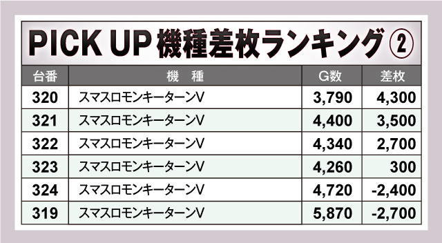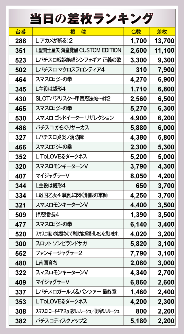 まずは差枚ランキングのチェックから。30台すべてが差枚+2,000枚オーバーで、+5,000枚オーバーは13台出現。それらのなかでもっとも優秀だったのは、288番台の「L アカメが斬る! 2」で、差枚は大台突破の+13,700枚を獲得! またランクイン機種を見渡してみると、導入まもない最新機種を含めたスマスロが大半を占め、またジャグラーシリーズも多数ランクイン! ハイスペック機種からノーマルタイプまで幅広い機種にチャンスが隠されていたようだ!