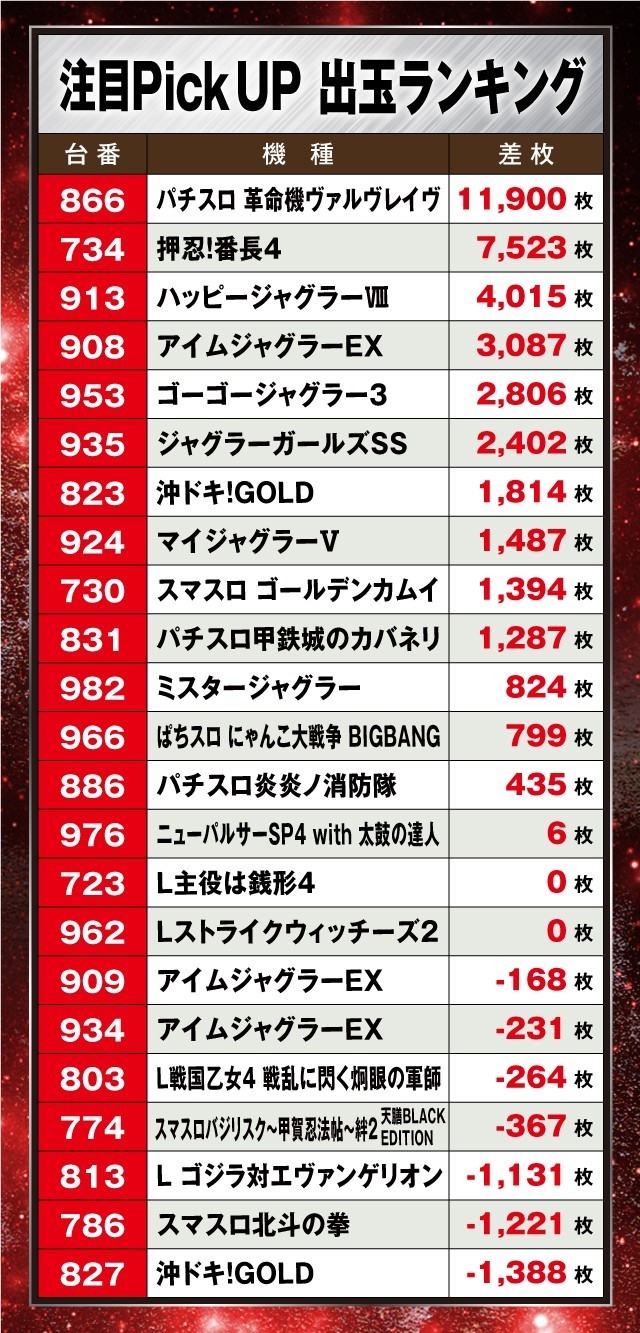 この日は、スマスロとジャグラーシリーズをメインに好調台が多数出現、『パチスロ 革命機ヴァルヴレイヴ』で万枚超の+11,900枚、『押忍!番長4』では+7,523枚を記録する見事な結果を残している。