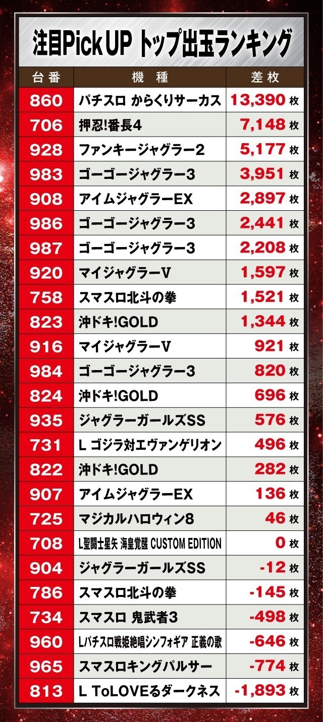 早速、店内の様子をチェックしてみると、この日は『パチスロ からくりサーカス』で好調台を確認、怒涛の+13,390枚を叩き出し堂々のランキング1位に輝いた。次いで『押忍!番長4』が+7,148枚という見事な結果を残している。