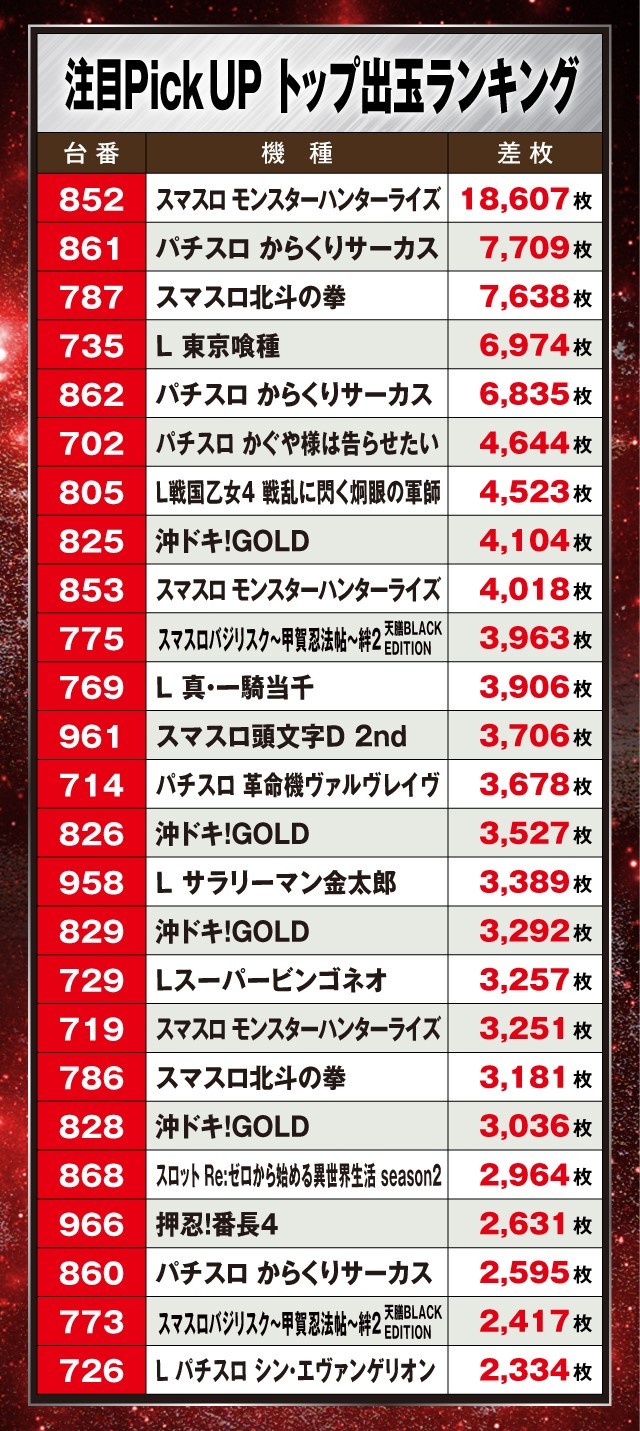 この日、店内で最もプレイヤーの注目を集めていたのが『スマスロ モンスターハンターライズ』で、怒涛の+18,607枚を叩き出し2位に大差を付ける堂々のランキングトップに輝いた。