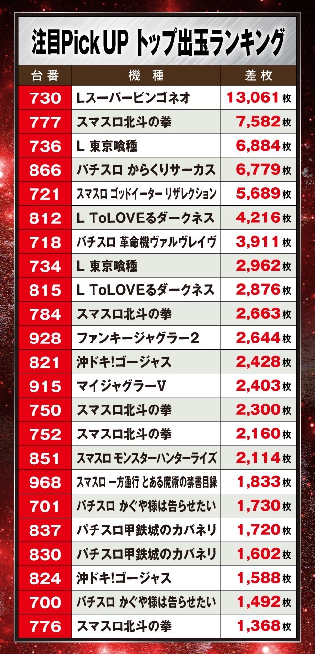 この日、最もプレイヤーの注目を集めたのが『Lスーパービンゴネオ』で、万枚超の+13,061枚を叩き出し堂々のランキングトップに輝いた。次いで、『スマスロ北斗の拳』から+7,582枚、『L 東京喰種』から+6,884枚が確認されている。