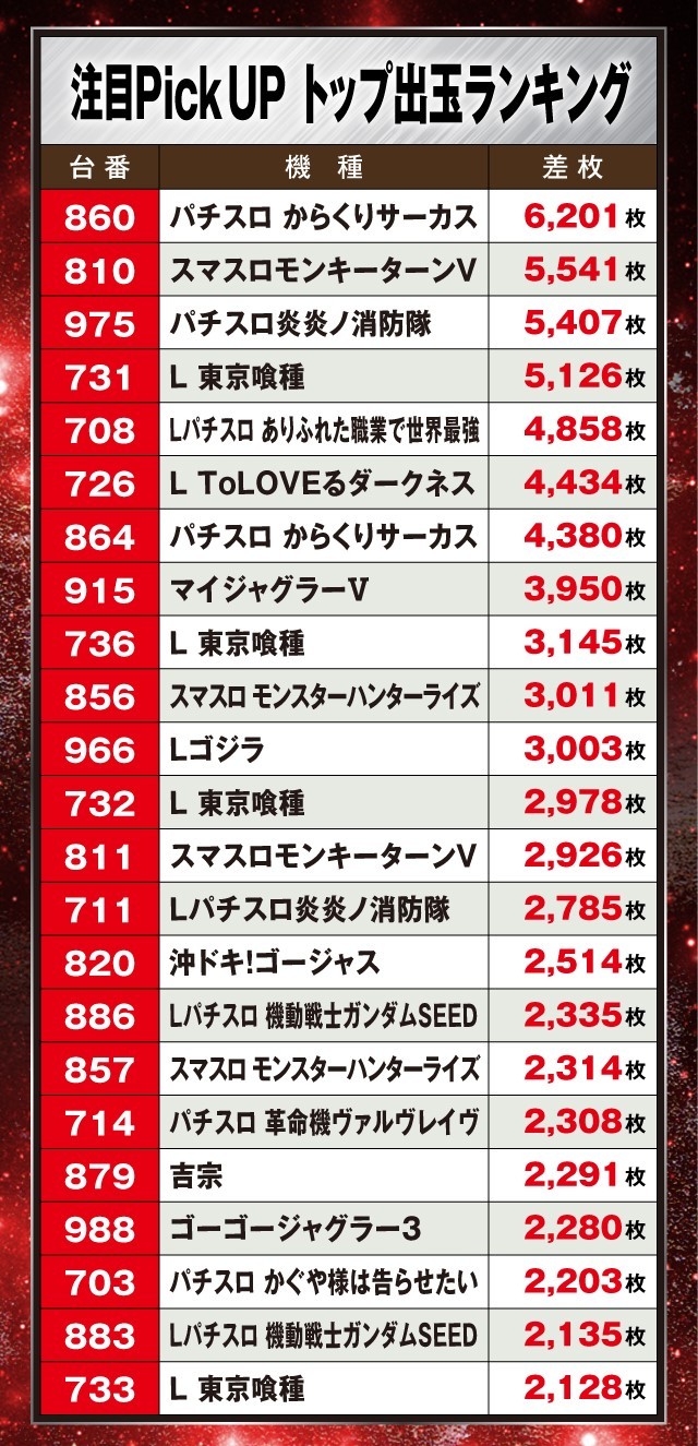 また、その他の機種では『スマスロモンキーターンV』と『パチスロ炎炎ノ消防隊』、さらには『L 東京喰種』が+5,000枚超を記録するなど、様々な機種から好成績が発生。広範囲に渡ってチャンスが潜んでいたのは間違いないだろう。