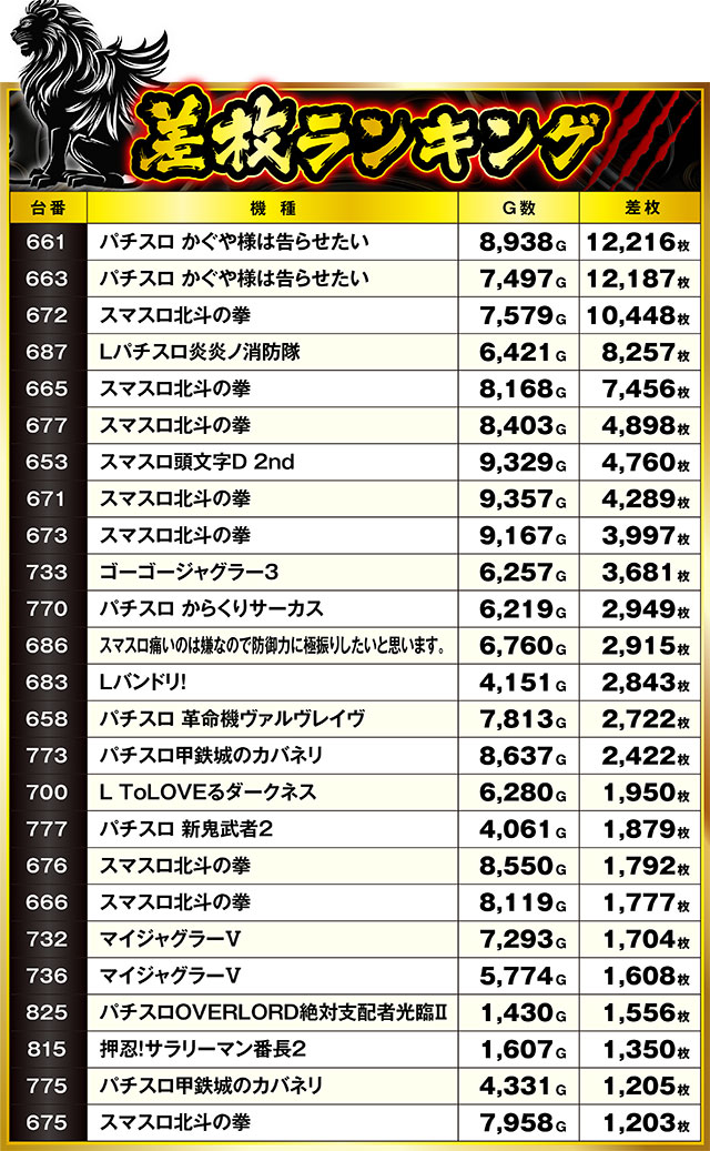 なんと10,000枚オーバー記録が3台も誕生したこの日。しかも1・2フィニッシュを決めたのは『パチスロ かぐや様は告らせたい』だった。3位に入賞した『スマスロ北斗の拳』はこの3位記録だけでなく、TOP25に8台もランクインする強者ぶりを披露!