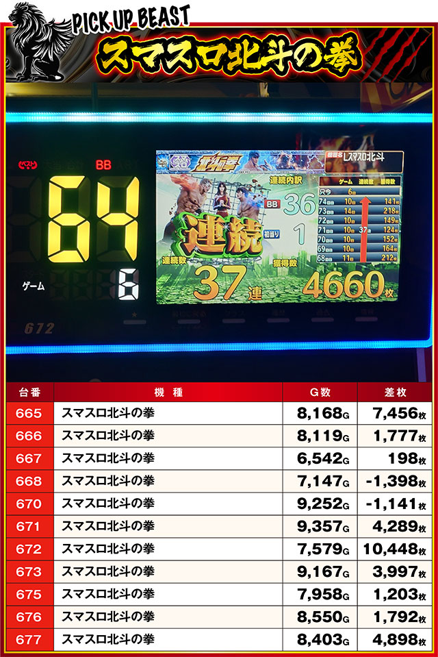 11台設置中9台がプラスというとてつもない好環境だった『スマスロ北斗の拳』。プラスの9台中8台がTOP25に食い込む結果となっており、この日一番の優良シマだったのは間違いないだろう。