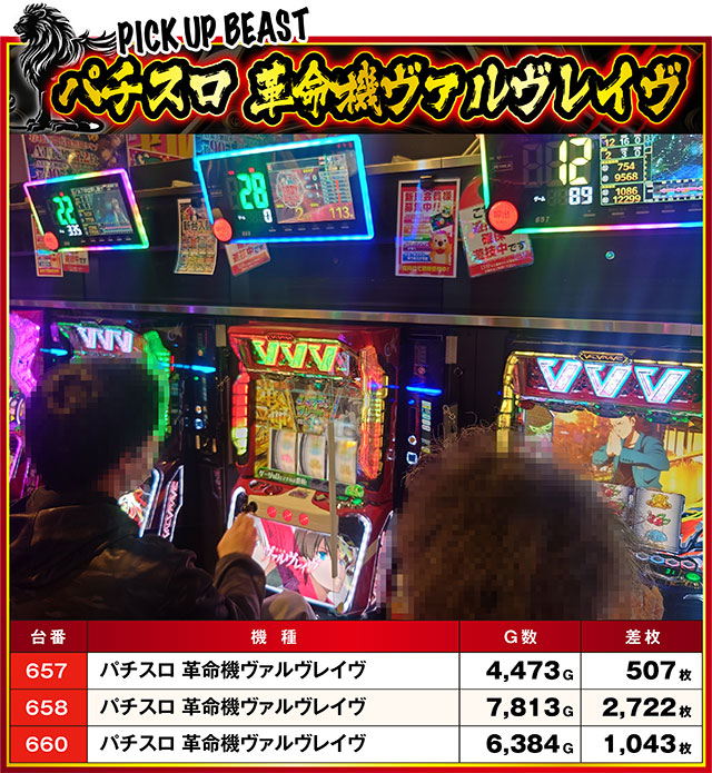 3台すべてがプラス差枚となった『パチスロ 革命機ヴァルヴレイヴ』。残念ながら3,000枚を上回る結果が生まれなかったが、環境自体は悪くなかった様子だった。