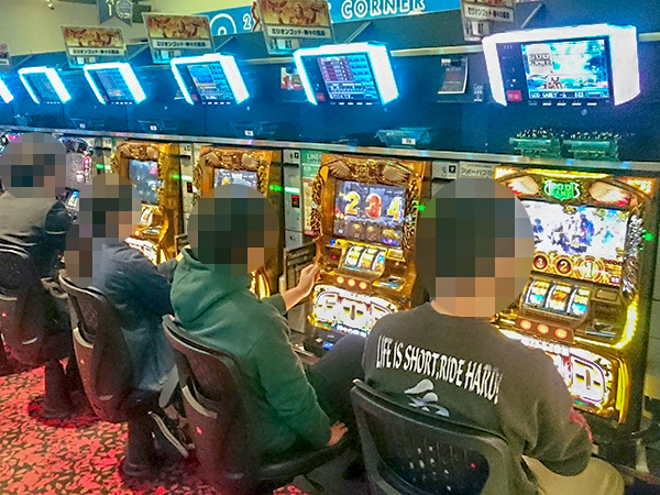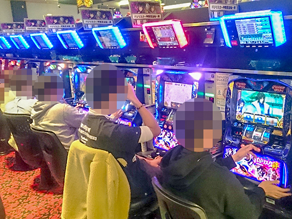 2円パチスロは機種を問わず好評の様子。楽しそうにレバーを叩くプレイヤーが多かった。