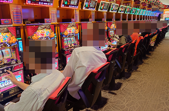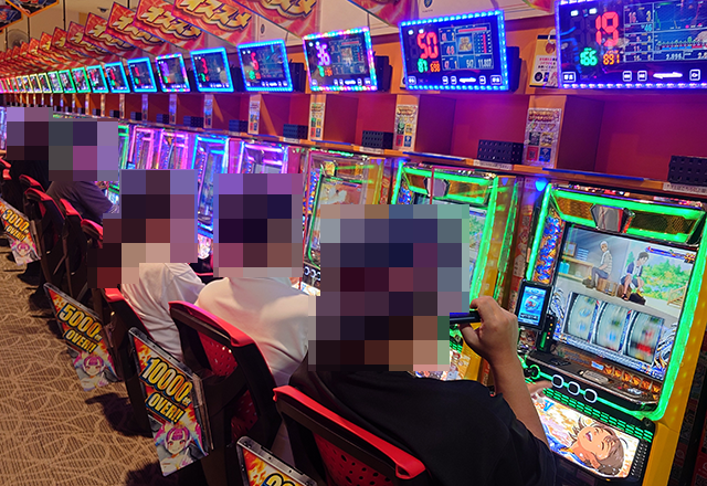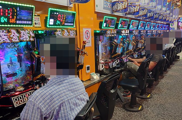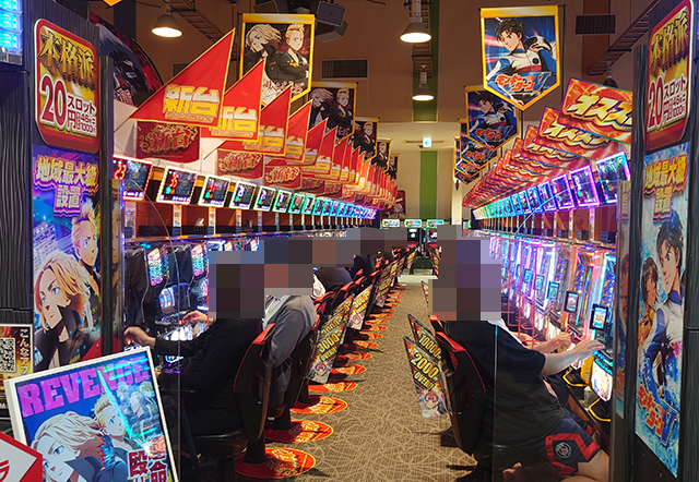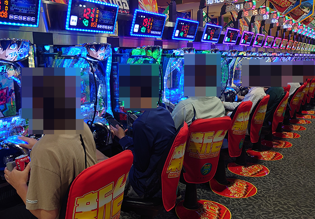 取材時は最新機種の「eフィーバーブルーロック」がほぼ満席となっており、大当り回数がすでに2ケタを超えている台も多かった。