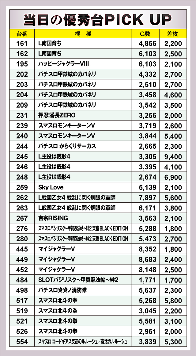 まずは優秀台30台を紹介していこう。30台のうち27台が差枚+2,000枚を超えており、+3,000枚超えは11台出現。それらのなかでもっとも優秀だったのは、245番台の「L主役は銭形4」で、差枚+9,400枚を獲得! 当日は最優秀台を獲得した「L主役は銭形4」をはじめ、「L戦国乙女4 戦乱に閃く炯眼の軍師」「スマスロ北斗の拳」などのスマスロが大活躍! さらに「パチスロ甲鉄城のカバネリ」やジャグラーシリーズなど、店内全体で幅広い機種が賑わいを見せていたぞ!