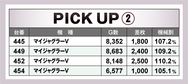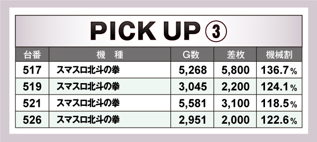 続いては、当日とくに店内を盛り上げた3機種を紹介していこう。まず「パチスロ甲鉄城のカバネリ」は、3台並びを含めた4台をピックアップ。4台の平均差枚は、当日トップクラスの+3,375枚の好結果をマーク! 続いて「マイジャグラーⅤ」は、ピックアップ4台すべてが4ケタオーバーのプラスで、平均G数は7,940Gと終日しっかり回されていた! そして「スマスロ北斗の拳」は、ピックアップ4台平均差枚+3,275枚とこちらも素晴らしい記録を残していた!