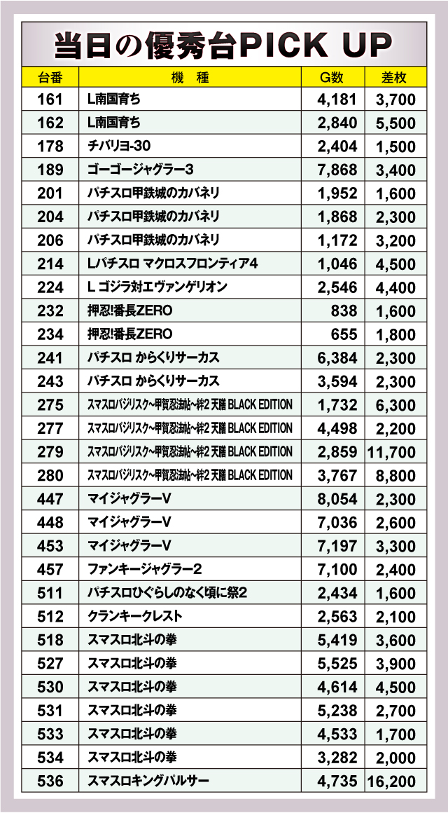 まずは優秀台30台の紹介から。30台のうち24台が+2,000枚オーバーで、そのうち+3,000枚オーバーは14台。そして+10,000枚オーバーは2台出現と店内は大盛り上がり! それらのなかでもっとも優秀だったのは、なんと意外な機種の536番台「スマスロキングパルサー」で、+16,200枚とあわやコンプリートという素晴らしい結果をマーク! またランクイン機種を詳しく見てみると、人気のスマスロである「スマスロ北斗の拳」「スマスロバジリスク~甲賀忍法帖~絆2 天膳 BLACK EDITION」のほか新台やノーマルタイプまでさまざまな機種がランクインしていた!