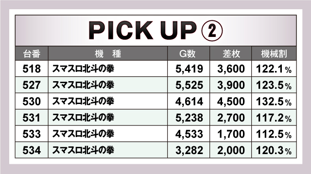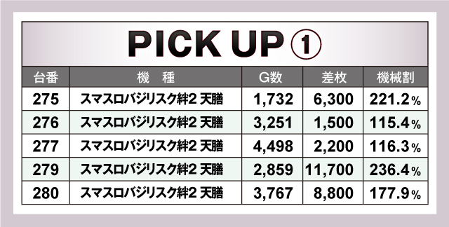 続いては、先ほど紹介した人気のスマスロ2機種紹介。まず「スマスロバジリスク~甲賀忍法帖~絆2 天膳 BLACK EDITION」は、279番台の+11,700枚を筆頭に+5,000枚オーバー台が多数出現し、ピックアップ5台平均差枚はなんと+6,100枚と当日トップクラスの好成績! 続いて「スマスロ北斗の拳」は、こちらも+3,000枚クラスの良台が多数で、ピックアップ6台の平均差枚は+3,067枚と好記録をマーク。これら2機種が当日の盛り上がりを牽引していたのは間違いなさそうだ!