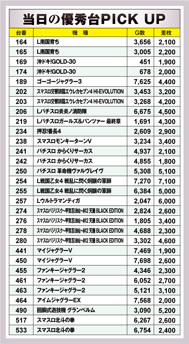 まずは優秀台30台のチェックから。30台のうち27台が+2,000枚オーバーを記録し、+3,000枚オーバーは14台出現。それらのなかでもっとも優秀だったのは、254番台の「L戦国乙女4 戦乱に閃く炯眼の軍師」で、差枚+7,100枚をマーク! またランクイン機種を見渡すと、スマスロを筆頭に多種多様な機種がランクインしていたので、店内の至る所にチャンスが隠されていた可能性が高そうだ!
