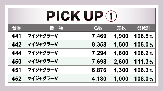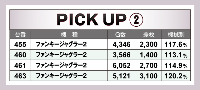 続いては、当日特に賑わっていたジャグラーシリーズ2機種を紹介しよう。まずは「マイジャグラーV」で、ピックアップ6台の平均差枚は+1,683枚と素晴らしい結果を残していた! 次に「ファンキージャグラー2」は、ピックアップ4台のうち3台が+2,000枚オーバーをマークし、平均差枚も+2,375枚をマーク。これら2機種は、スマスロなどハイスペック機種に負けない好記録を残していた!