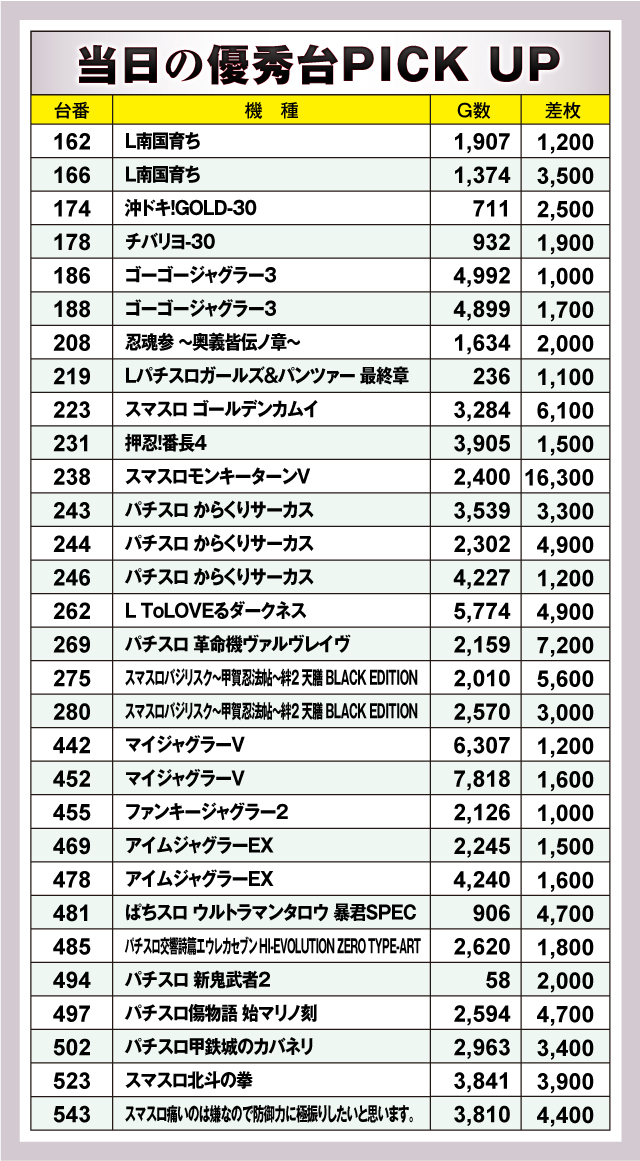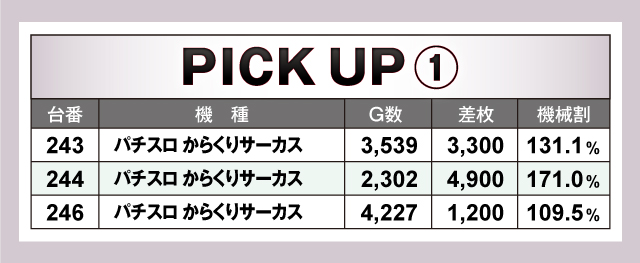 続いては、当日特に賑わっていた「パチスロ からくりサーカス」を紹介しよう。ピックアップ3台すべてが4ケタオーバーのプラスを獲得しており、その平均差枚は+3,133枚と優秀な成績をマーク! 同機が注目度が高かった機種で間違いないが、その他にも良台が多数確認することができた!