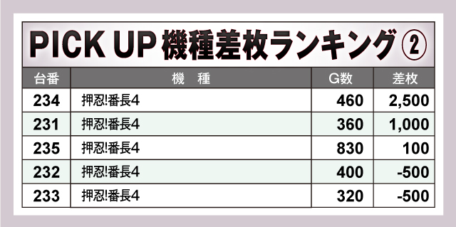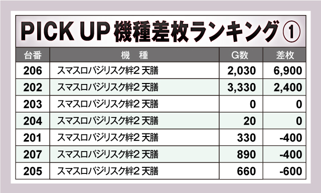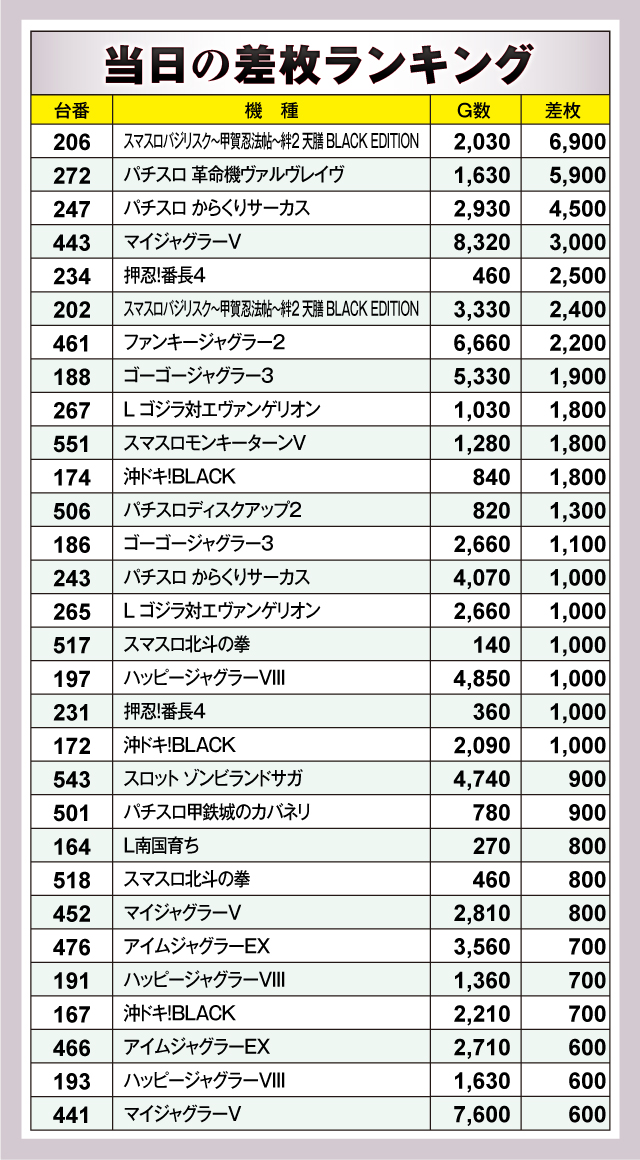 まずは差枚ランキングのチェックから。30台のうち19台が+1,000枚オーバーで、+3,000枚オーバーは4台出現。それらのなかでもっとも優秀だったのは、206番台の「スマスロバジリスク~甲賀忍法帖~絆2 天膳 BLACK EDITION」で、差枚は+6,900枚を獲得! またランクイン機種を見渡してみると、スマスロが大半を占めるなかジャグラーシリーズが複数ランクイン! ハイスペック機種からノーマルタイプまで幅広い機種にチャンスが隠されていたようだ!