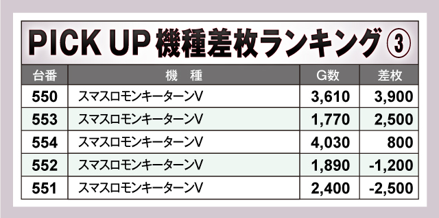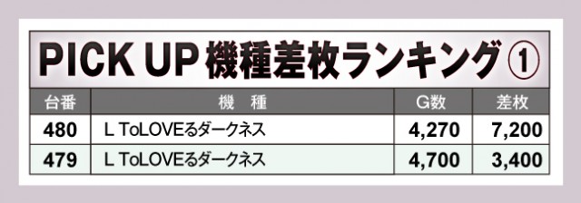 続いては、当日とくに盛り上がっていた3機種を紹介。3機種全てがトータルプラスで終了しており、とくに「L ToLOVEるダークネス」は、ピックアップ2台どちらも4ケタプラス終了と圧倒的数値をマーク! また「スマスロモンキーターンV」は、ピックアップ5台のうち2台が+2,000枚オーバーのプラスとこちらも申し分のない記録を残していた!