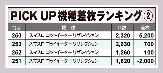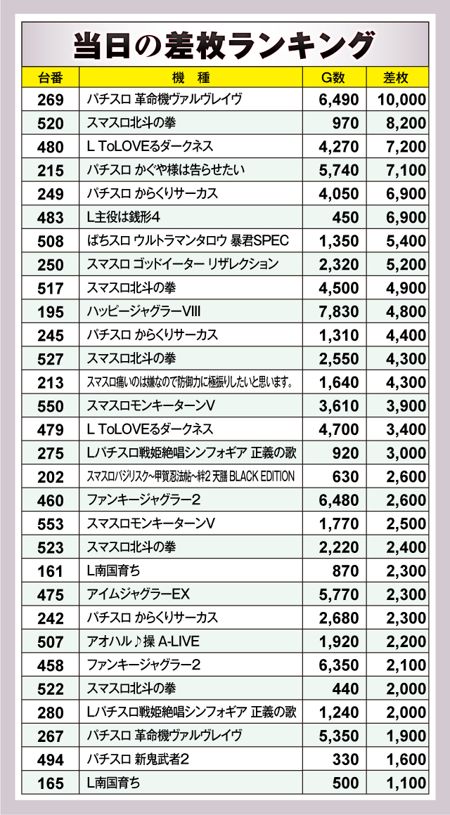 まずは差枚ランキングのチェックから。30台のうち27台が+2,000枚オーバーで、+3,000枚オーバーは16台出現。それらのなかでもっとも優秀だったのは、269番台の「パチスロ 革命機ヴァルヴレイヴ」で、差枚は+10,000枚を獲得! またランクイン機種を見渡してみると、スマスロを筆頭にさまざまな機種がランクイン。ハイスペック機種からノーマルタイプまで幅広い機種にチャンスが隠されていたようだ!