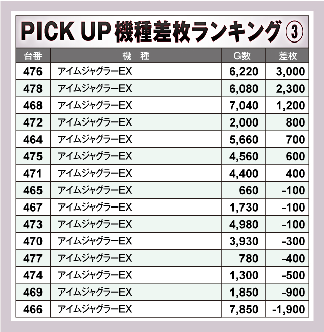 まずは優秀台30台のチェックから。30台のうち19台が+2,000枚オーバーを記録し、+3,000枚オーバーは12台出現! それらのなかでもっとも優秀だったのは、552番台の「スロット Re:ゼロから始める異世界生活 season2」で、差枚は+11,700枚と素晴らしい記録をマーク! その他ランクイン機種には、人気スマスロ機種をはじめジャグラーシリーズや最新機種など、店内のあらゆる機種にチャンスがあったようだ!