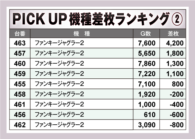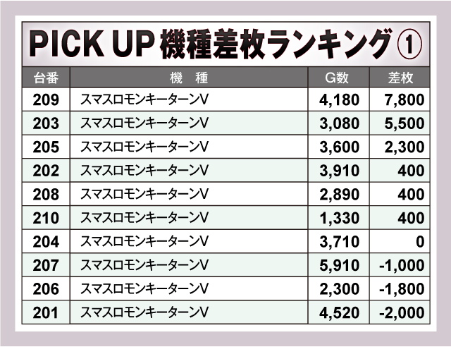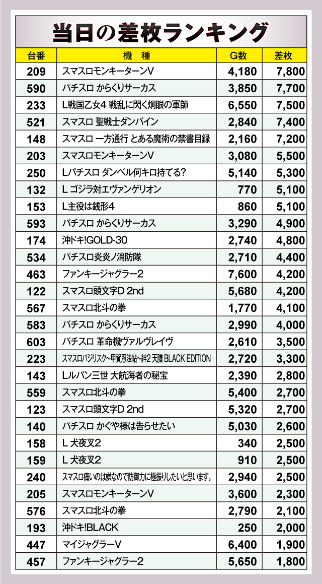 まずは差枚ランキングトップ30台のチェックから。30台のうち28台が+2,000枚オーバーを記録し、+3,000枚オーバーは18台出現! それらのなかでもっとも優秀だったのは、209番台の「スマスロモンキーターンV」で、差枚は+7,800枚と素晴らしい記録をマーク! その他ランクイン機種には、人気スマスロ機種をはじめジャグラーシリーズや最新機種など、店内のあらゆる機種にチャンスがあったようだ!