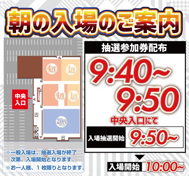 ①抽選参加券配布『9:40~』②入場抽選『9:50~』 |