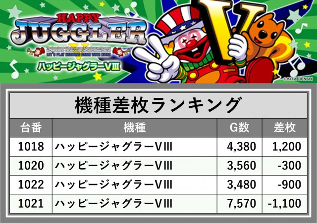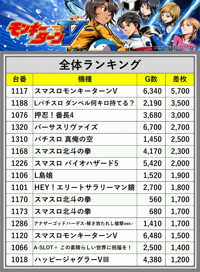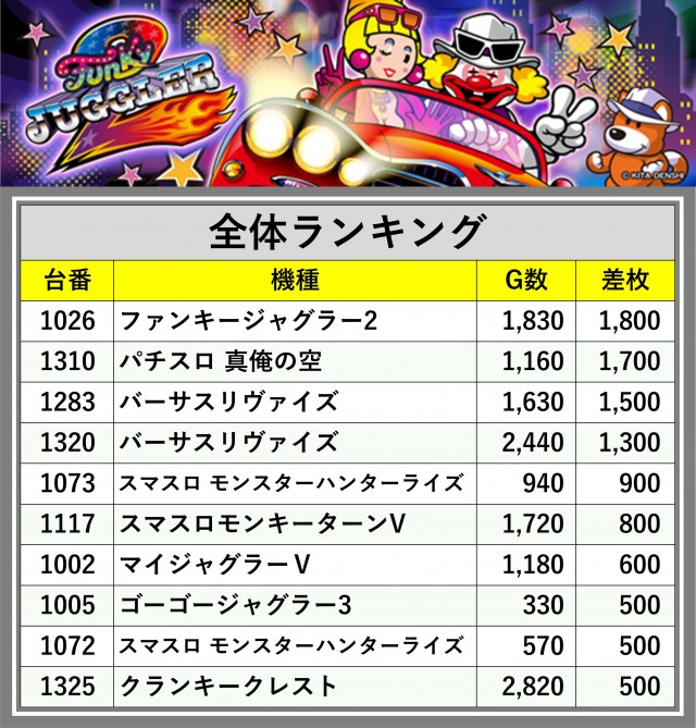 厳選された取材対象機種をはじめ、その他スロット全体から好記録が飛び出した!プレイヤーが楽しんだ1日を下記データにて振り返ってみて欲しい。