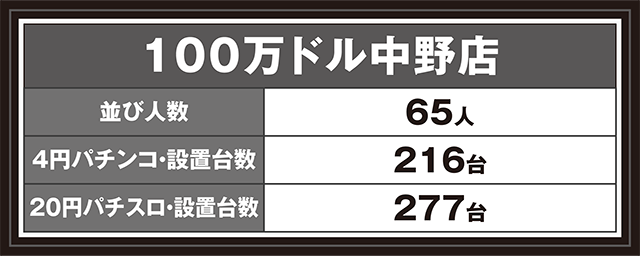 7月19日、長野県中野市にある「100万ドル中野店」へと向かった。今回の取材は、「豪腕取材」だ。パチンコ、パチスロともに、豪腕と呼べるほどの活躍をみせる姿が各所にあった。