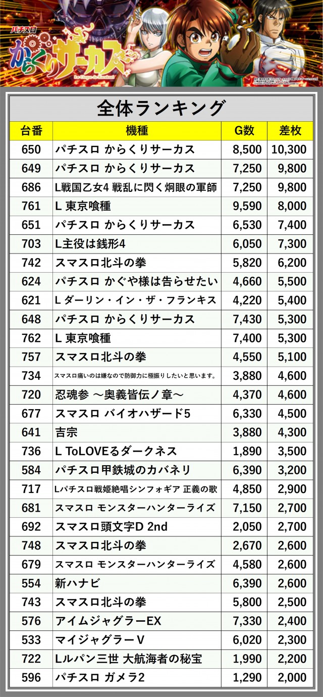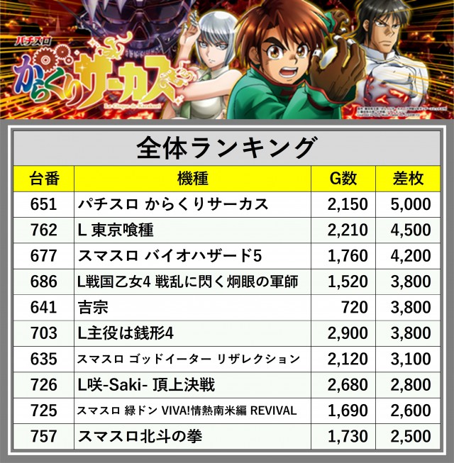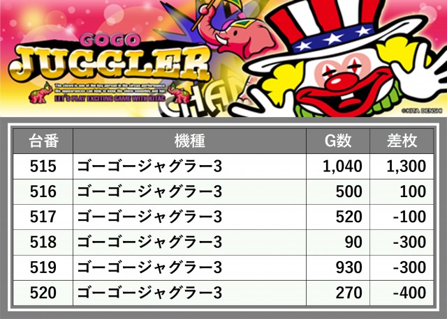 厳選された取材対象機種をはじめ、その他スロット全体から好記録が飛び出した!プレイヤーが楽しんだ1日を下記データにて振り返ってみて欲しい。