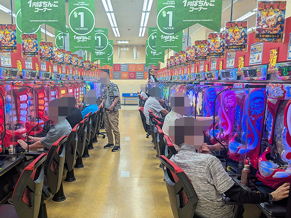 1円パチンコに目を移すと、「PA大海物語4スペシャル Withアグネス・ラム」や「PA大海物語5 Withアグネス・ラム」といった海物語シリーズに人気が集まっており、ほぼ満席となるほどのにぎわいを見せていた。