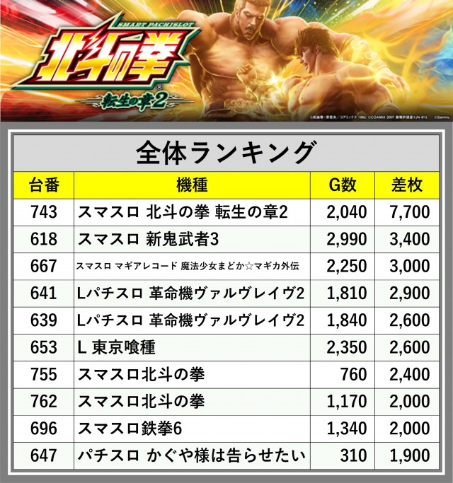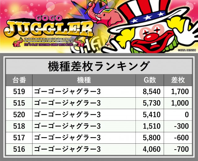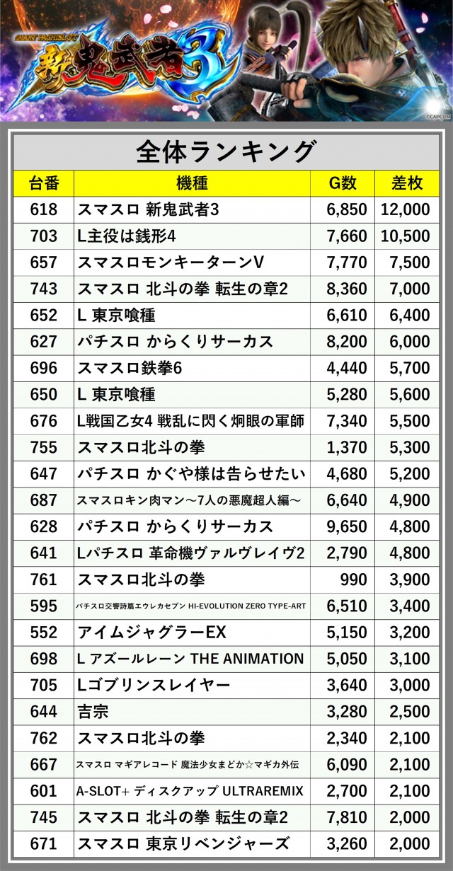 厳選された取材対象機種をはじめ、その他スロット全体から好記録が飛び出した!プレイヤーが楽しんだ1日を下記データにて振り返ってみて欲しい。