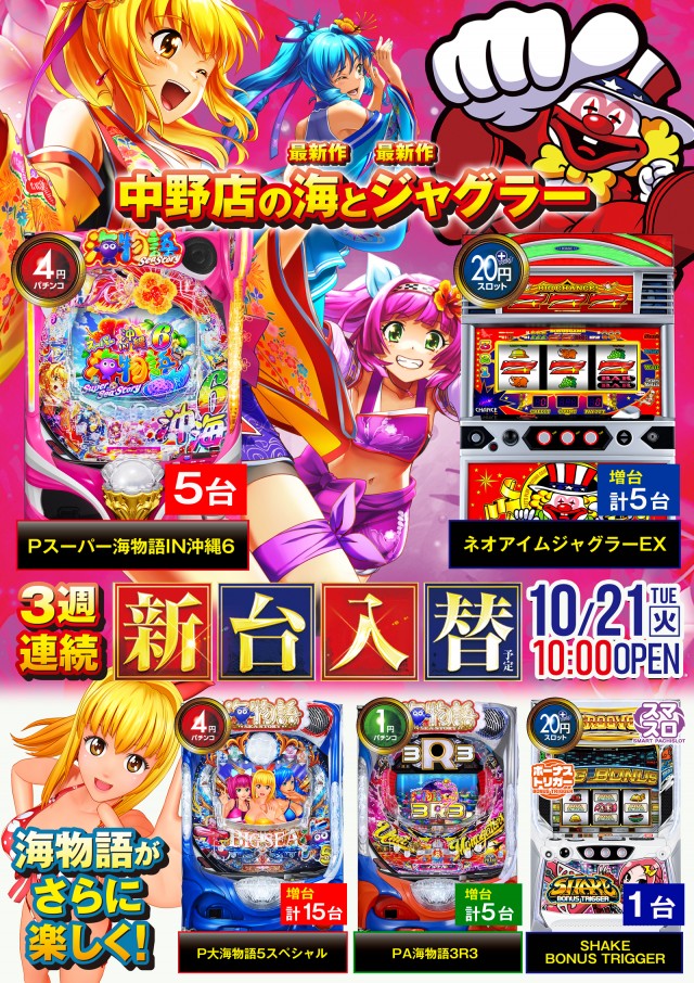 明日10月21日!新台入替『海とジャグラー最新作』導入&増台