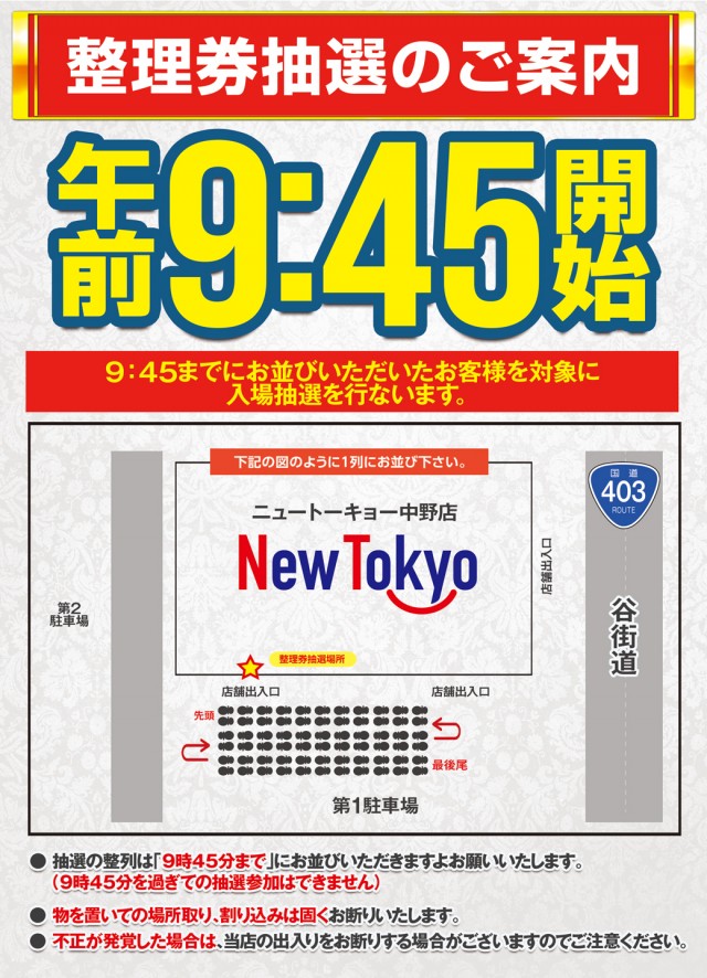 【毎日9時45分までにお並び頂いた方に入場順番抽選を行います】抽選後は指定の時間までに整列場所へ入場順番券の順に一列でお並びください!スタッフが誘導しますのでお気軽にお声掛けください。 |