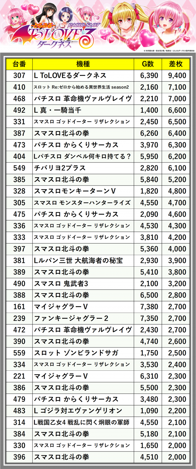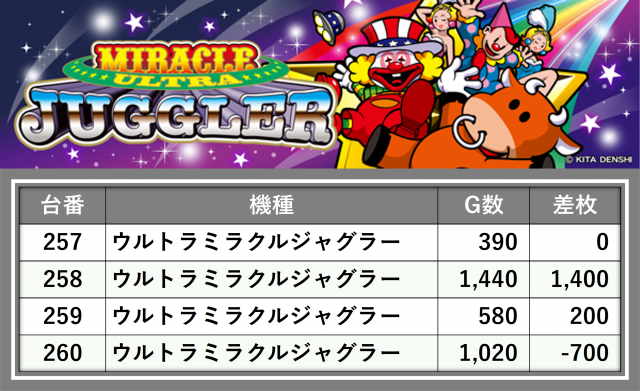 厳選された取材対象機種をはじめ、その他スロット全体から好記録が飛び出した!プレイヤーが楽しんだ1日を下記データにて振り返ってみて欲しい。