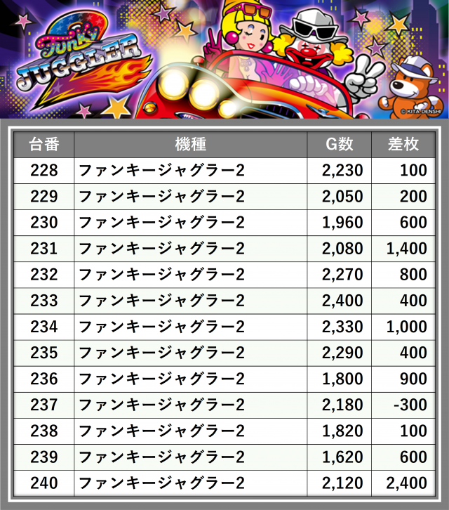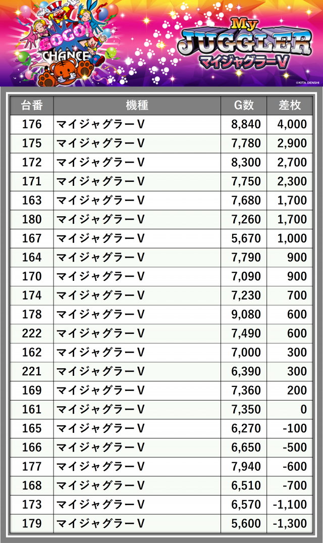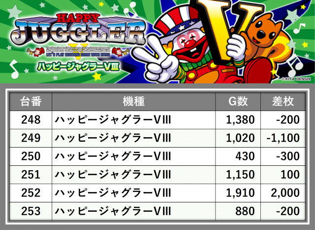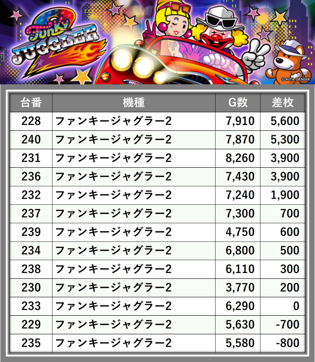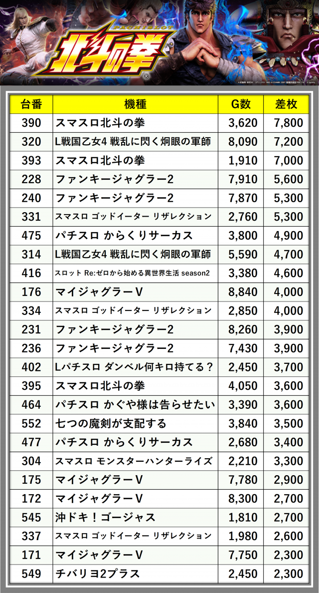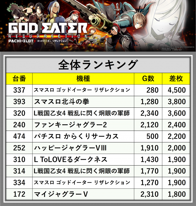 厳選された取材対象機種をはじめ、その他スロット全体から好記録が飛び出した!プレイヤーが楽しんだ1日を下記データにて振り返ってみて欲しい。