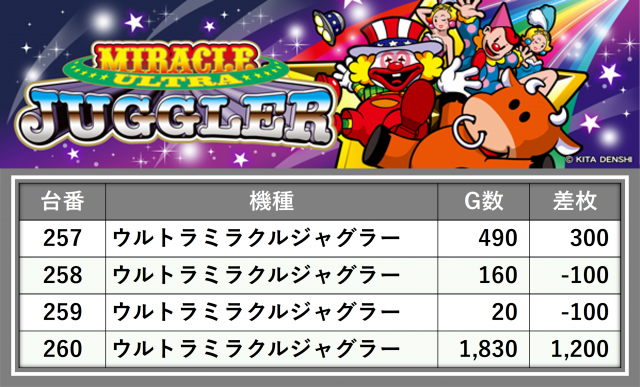 厳選された取材対象機種をはじめ、その他スロット全体から好記録が飛び出した!プレイヤーが楽しんだ1日を下記データにて振り返ってみて欲しい。
