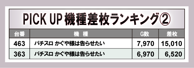 まずは当日の差枚ランキングのチェックから。25台すべてが差枚+2,000枚オーバーで、+5,000枚オーバーは8台出現。それらのなかでもっとも優秀だった台は、463番台の「パチスロ かぐや様は告らせたい」で、差枚は+15,010枚を獲得! またその他ランクイン機種を見渡すと、人気スマスロ機を中心に、メダル機が多数ランクイン。幅広い機種で盛り上がりを見せていた!